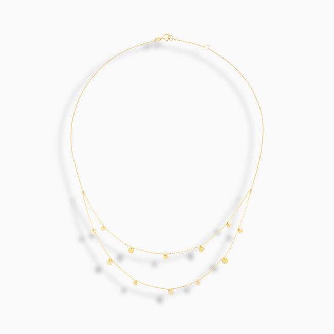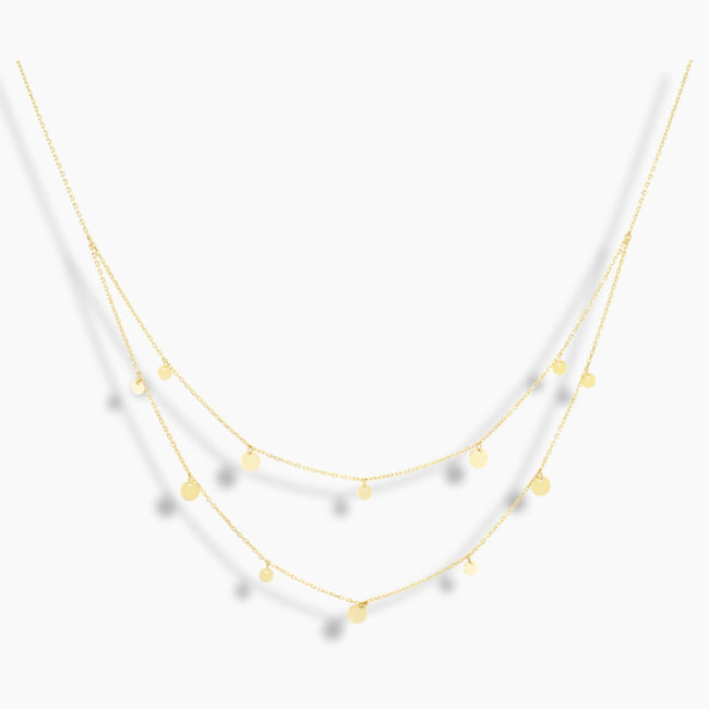 Go for the perfect luxe layered look with this delicate two strand, 14K gold chain necklace with dangling gold discs.